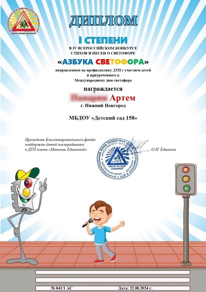 Поздравляем нашего воспитанника группы № 2 Артема, участника VII Всероссийского конкурса по ПДД «Светофорова наука»,